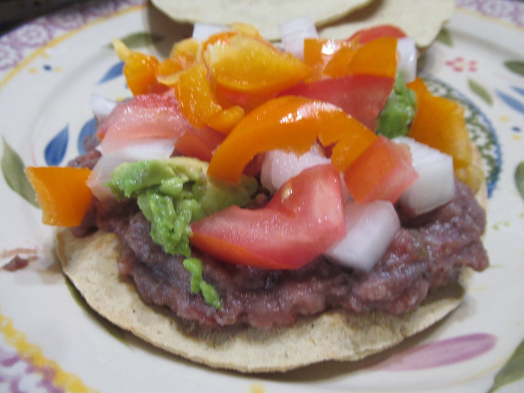 So, here is yesterdays lunch. the refried black beans, baked tostada shells, no oil, avocado, onion, orange bell pepper and tomato. Some salsa.