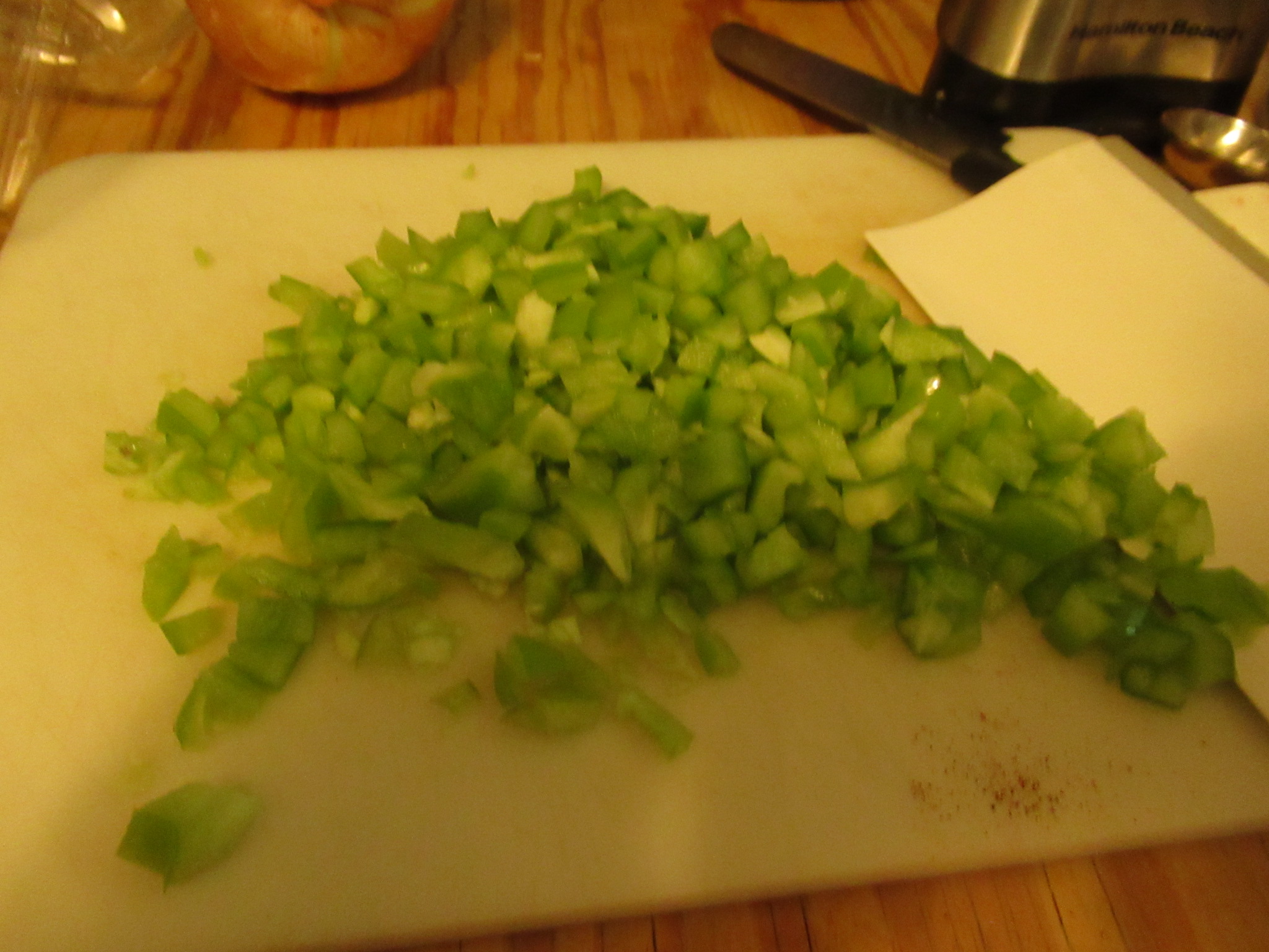 I then dice up a bell pepper and an onion , I usually dice them pretty small as we both like it better with smaller diced veggies.
