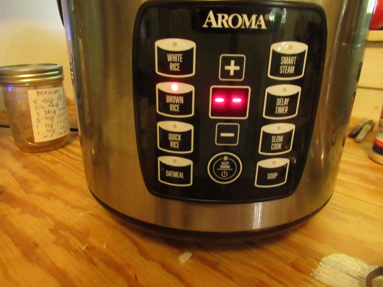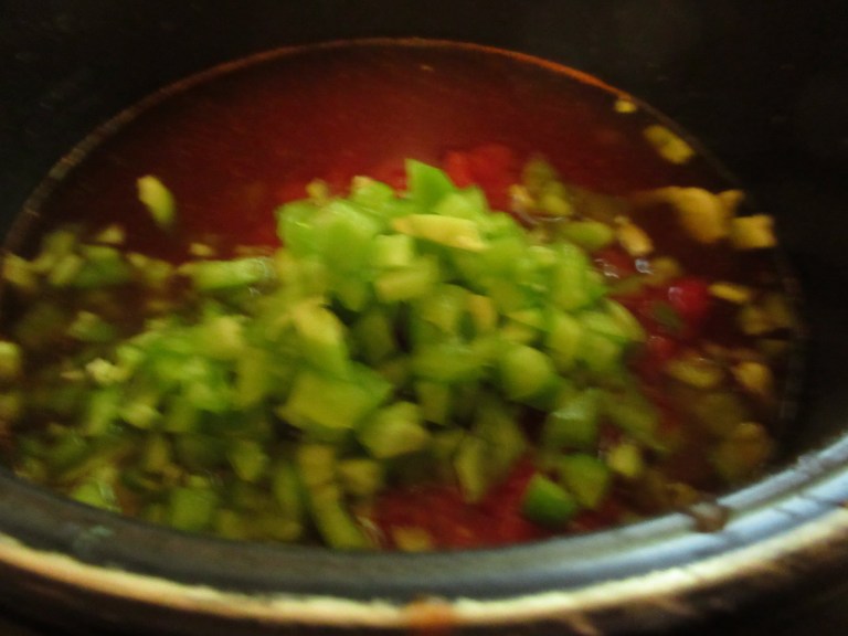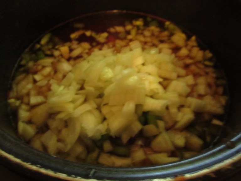 I dice up the bell pepper and the onion and add them to the pot. I stir them and turn on the crock pot and set it to brown rice.