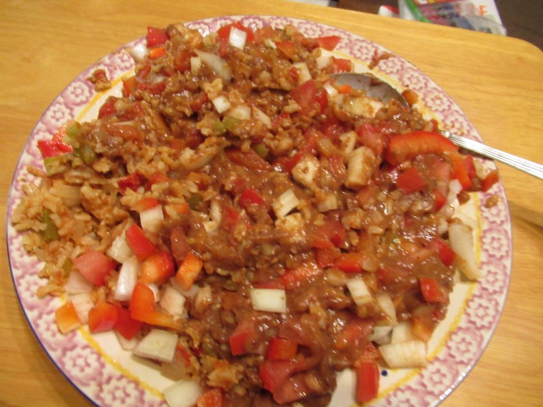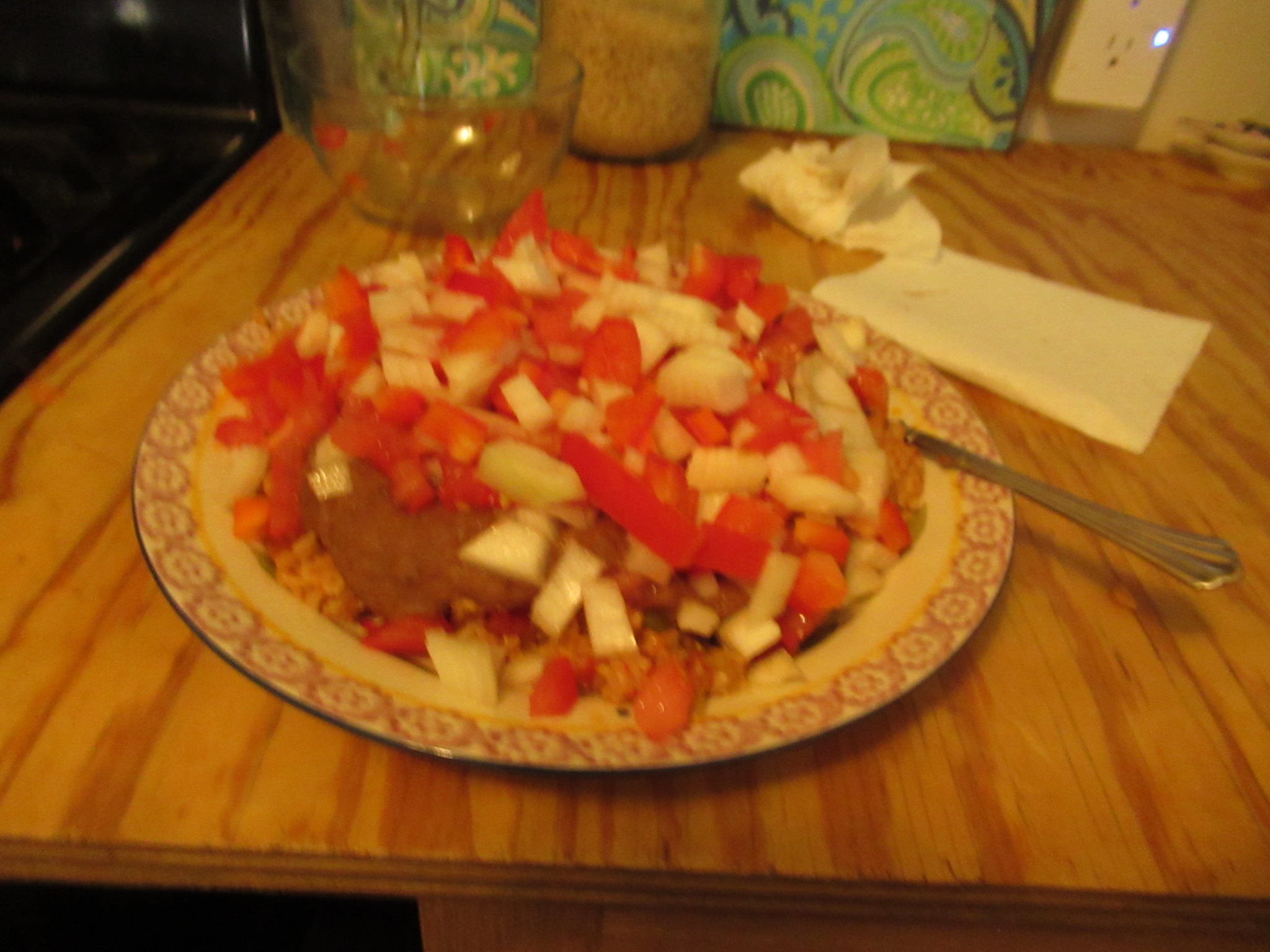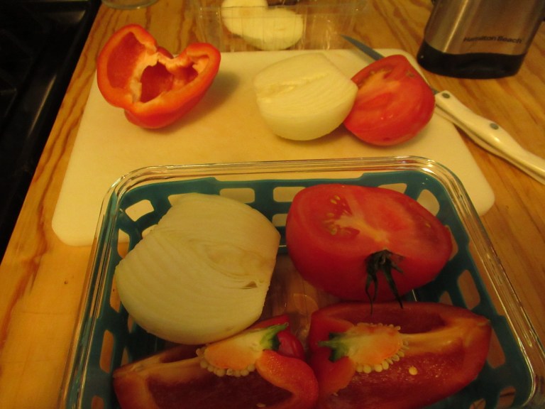 Now, I wanted more fresh veggies so I cut up half each of a bell pepper, tomato , and onion and put them on top