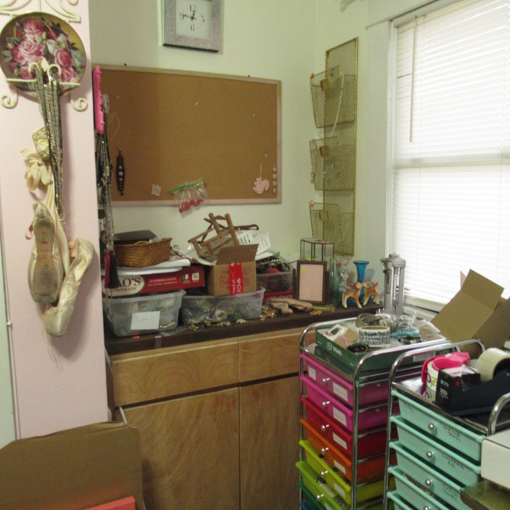 This is the resell room in all its disorganized glory. Let me be clear, all listed items are organized, just the non listed are a mess.